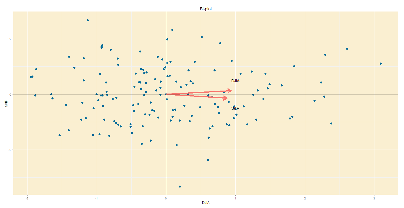 Arrows: The arrows point in the direction of increasing values for each original variable. For example, points in the top right quadrant will have higher DJIA readings than points in the bottom left quadrant. The closeness of the arrows means that the two variables are highly correlated.