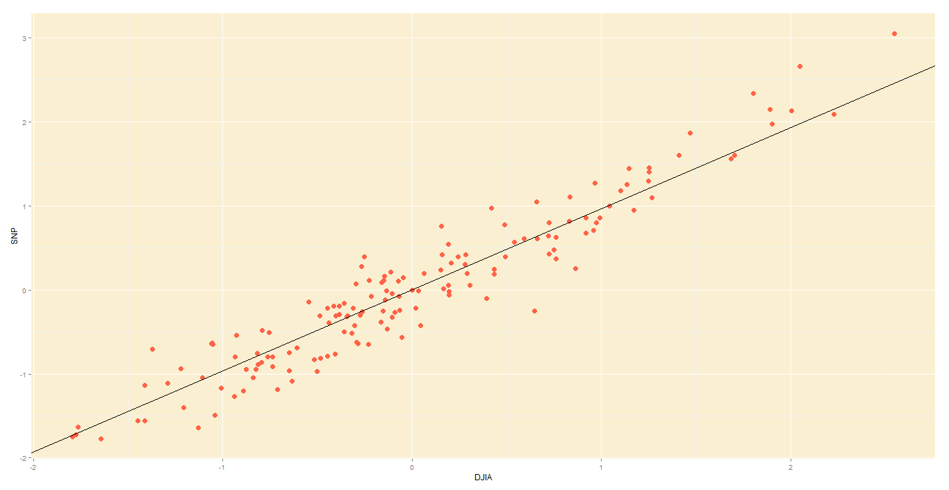 Standardize the scale of the data. I have already done this, by transforming the data into daily % change. Now, both DJIA and S&P data occur on a 0-100 scale.