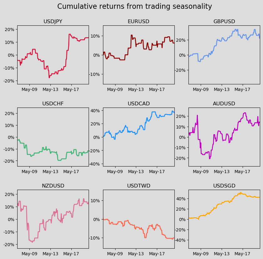 The results are decent, but they’re neither unanimous (some currencies do better than others) nor consistent over time (lately, seasonality hasn’t been doing that well).