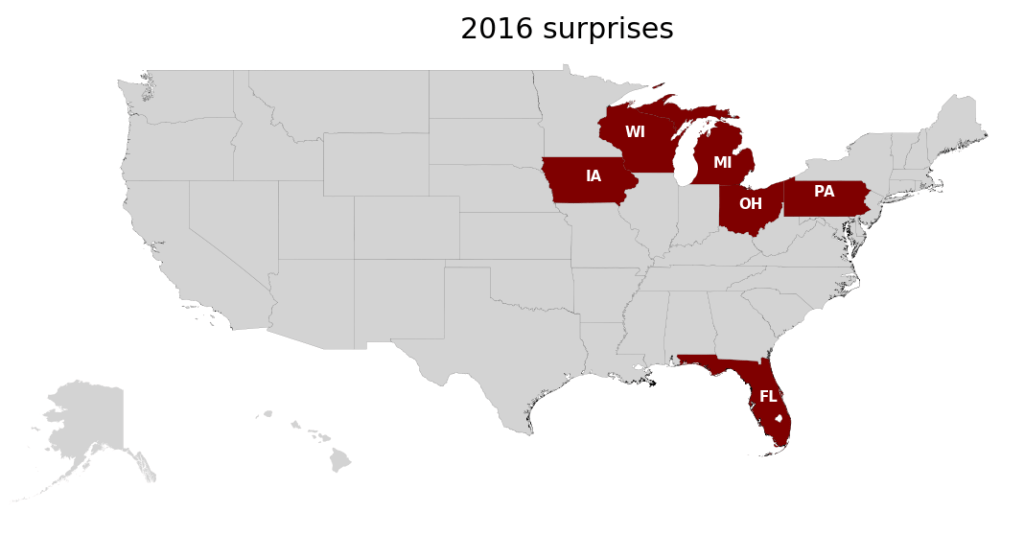 Surprise victories in FL, IA, PA, MI, OH, WI catapulted Trump into the White House