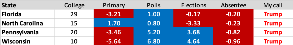 Since my call remains a Trump win with just 289 electoral college votes (306 in 2016), the loss of just Florida to Biden, or any two smaller states from the above table would change the outcome of the election. So I will keep monitoring polling and absentee data (the above table has been updated for polling data) and revise my calls if required.