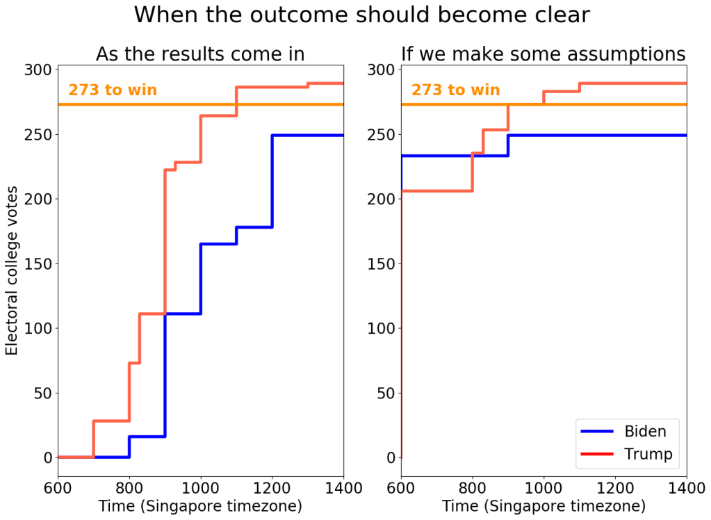 If a state reported results at the moment polls closed, then a Trump victory would be confirmed at 11am SGT on 4-Nov (3am London, 4-Nov / 10pm New York, 3-Nov). In reality, you would have to wait around an hour for the results to start trickling in. We can go one step further and make assumption about how the safer states will vote. This way, we should know the outcome even earlier from around 10am Singapore (4 Nov) / 2am London (4 Nov) / 9pm New York (3 Nov).