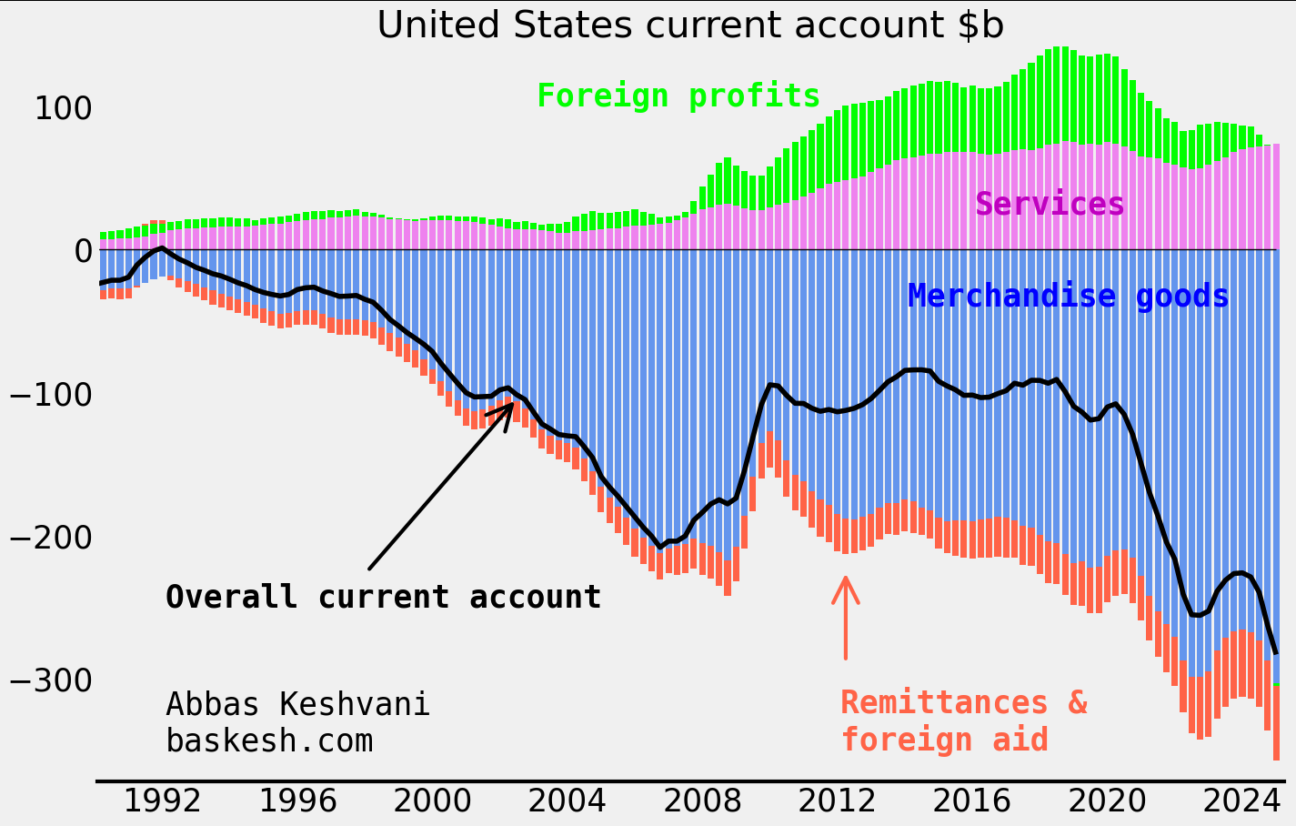 A gaping goods deficit. America experienced its first modern goods deficit in 1971, a product of the postwar industrial revival in Europe and Japan. Since then, US demand for foreign merchandise like cars and electronics have ballooned the deficit to $1.2 trillion or 3.7% of GDP in 2024. The goods deficit (blue in the below chart) dwarfs America’s surplus from services, like management consulting and software licenses. Aside from goods, other sources of outflows like foreign aid are also being targeted by Trump scaling back on America’s defense commitments.