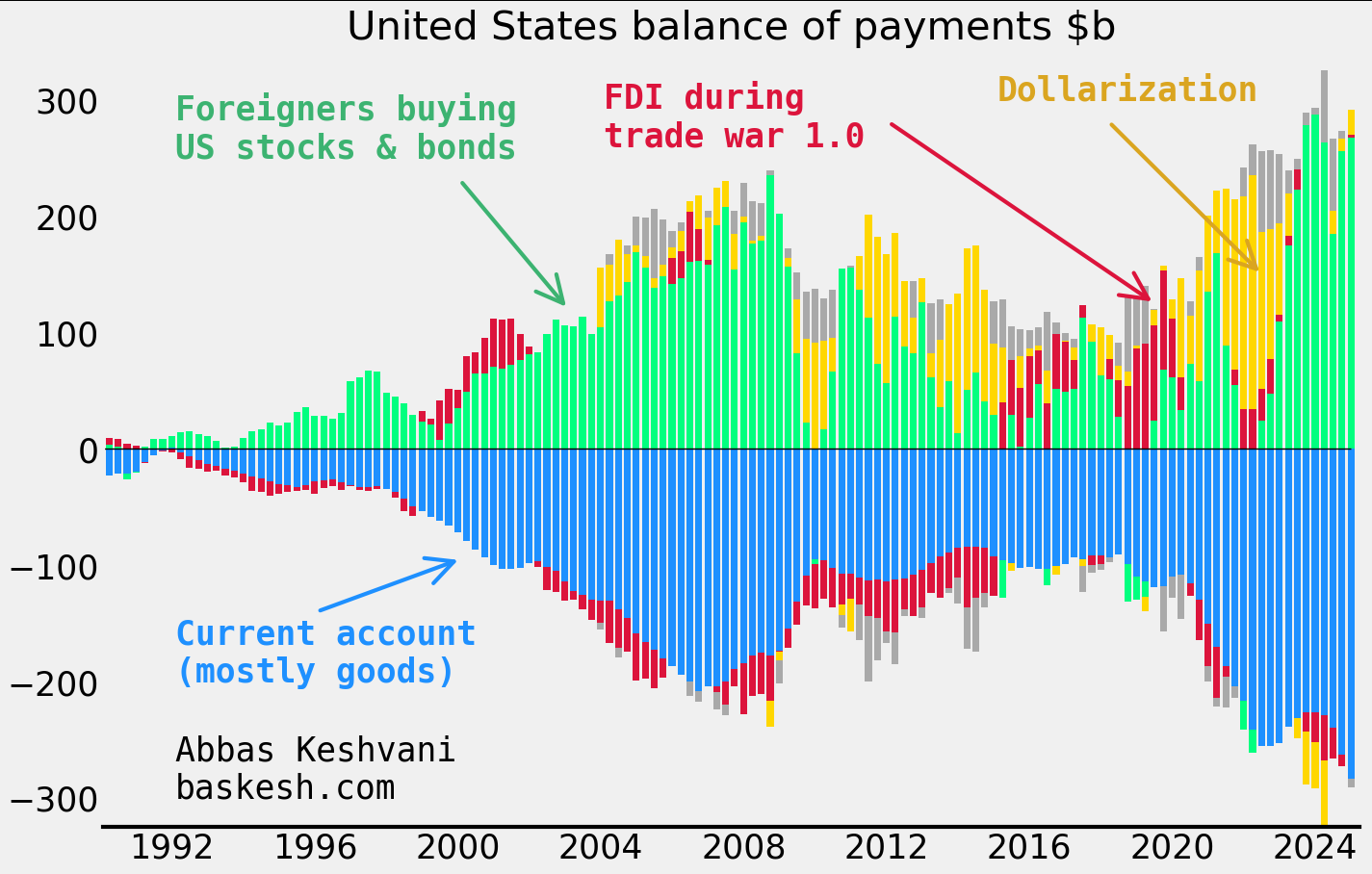 The money does come back eventually… The outflows from America’s goods deficit generally return back to the country via inbound foreign portfolio investment. As a result, the Chinese own 2.8% of outstanding US Treasuries, Koreans own 1.5% of Tesla stock, and so on… We can see this in America’s balance of payments (BOP), which tracks all cross-border flows, visualized in the next chart. US BOP essentially comprises of a wide current account deficit (blue) and large foreign inflows into American stocks and bonds (green).