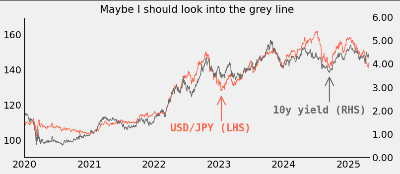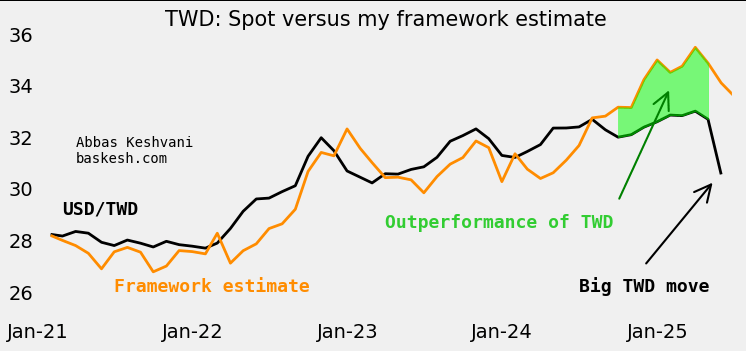 There were clues… Around the time that the central bank began selling dollars, TWD started trading stronger than my framework1 implied (this is all before the big move recently). This outperformance of TWD indicated that the currency was experiencing a regime shift. There is a lesson here: when one’s framework starts to “break down” it is a sign that something is afoot. This discrepancy from the model foreshadowed the 15 sigma move that we saw in early May 2025.