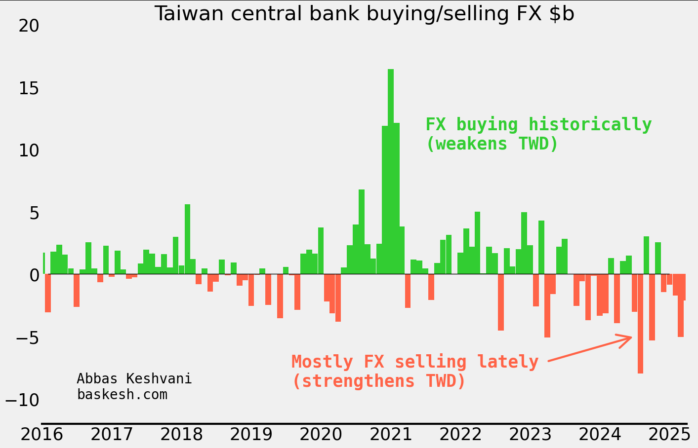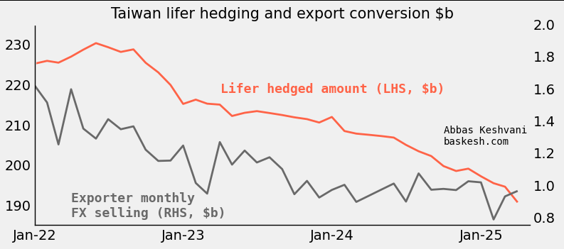 It’s the balance of payments, stupid. I type this on a laptop made in Taiwan, contributing to the island’s current account surplus of 14% of its GDP. Such a bounty would ordinarily lead to appreciation of TWD, but much of it is recycled back out by life insurance companies (“lifers”) and the central bank buying foreign assets like US Treasuries. What’s more, exporters tend to retain a lot of their proceeds in foreign currency. Altogether, the trifecta of lifers, exporters, and the central bank have been building up an epic long-dollar position for years.